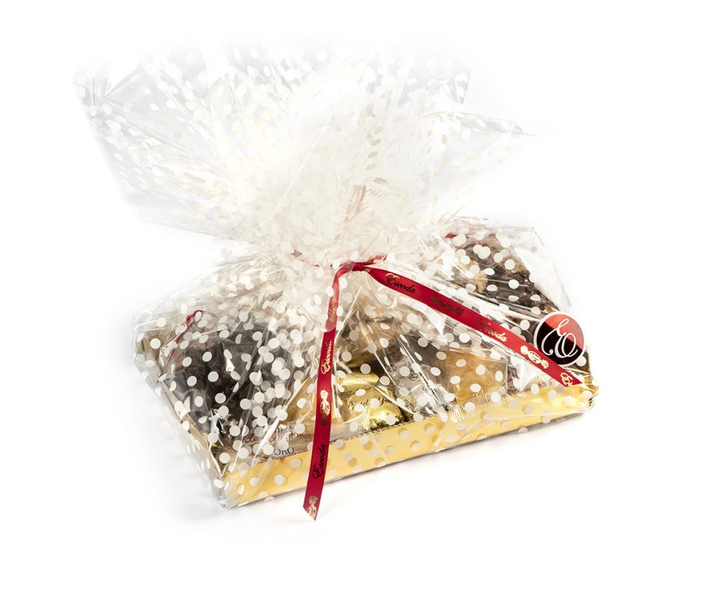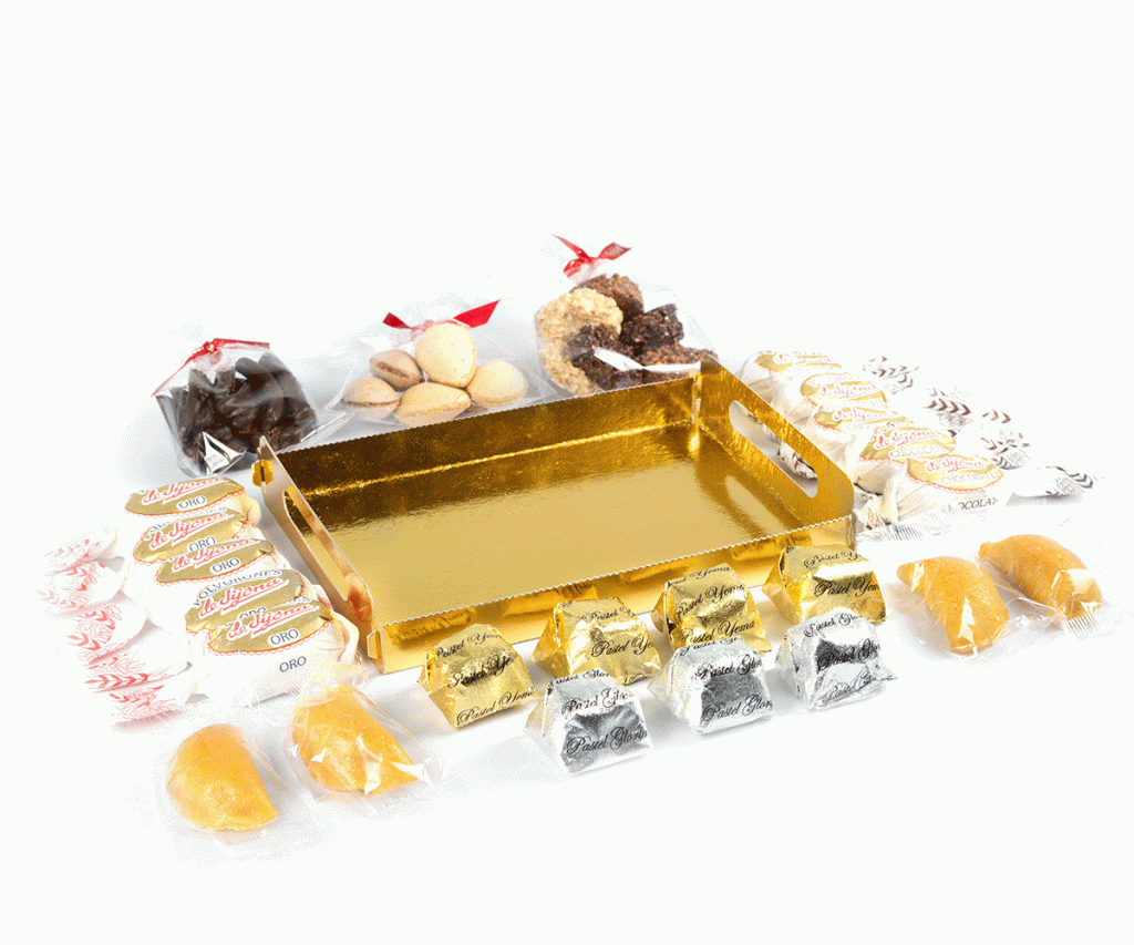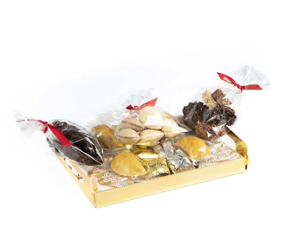Bandeja surtido delicatessen de 1Kg, el surtido incluye surtido de cacao, roquitas, tiras de naranja, polvorones oro, polvorones de chocolate, surtido con pasteles de gloria y yema, almendritas de oro y chocolate y empanadillas de batata y yema.