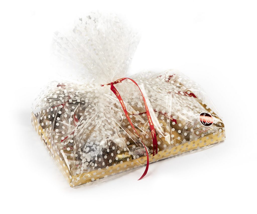 Bandeja surtido delicatessen de 2Kg, incluye surtido de cacao, roquitas, tiras de naranja, polvorones ORO, polvorones de chocolate, pasteles de gloria y yema, almendritas ORO y chocolate, figuritas, empanadillas de batata y yema, mazanuez, peladillas negras, peladillas blancas, peladillas con leche y yemitas.