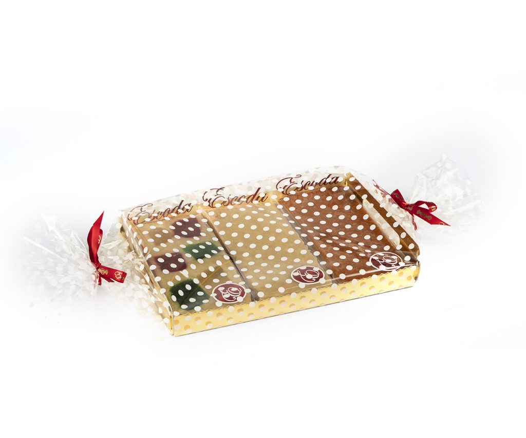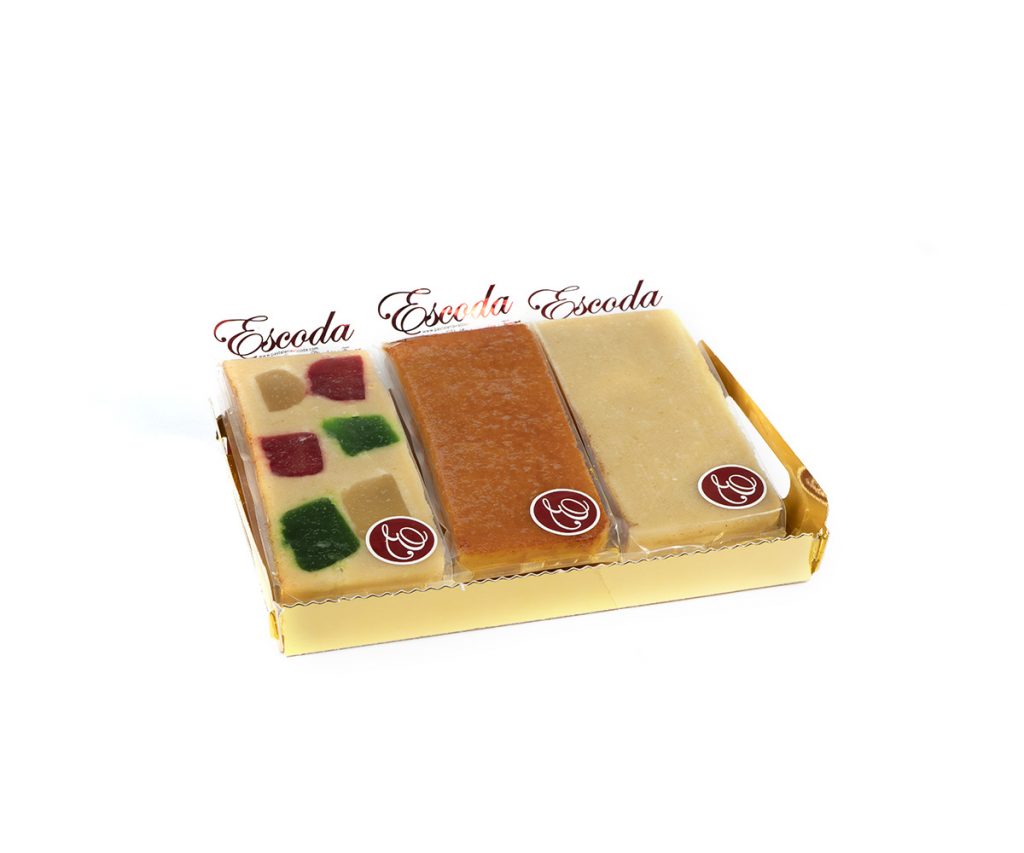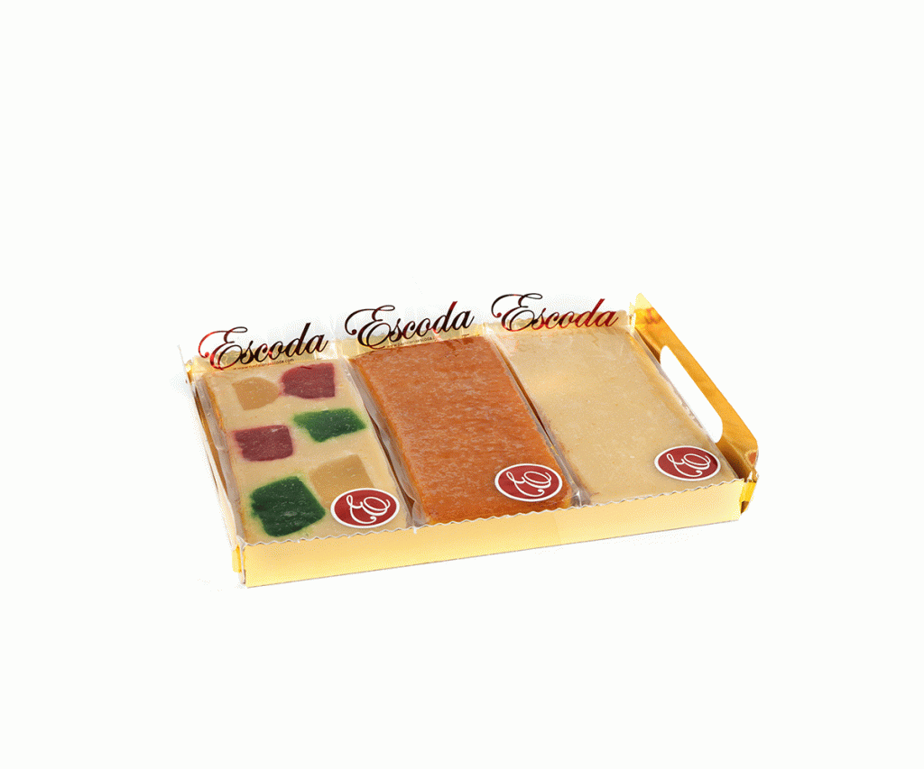 Bandeja de turrón que incluye nuestro delicioso turrón de nieve, nuestro turrón de yema tostada y nuestro sabroso turrón de fruta.