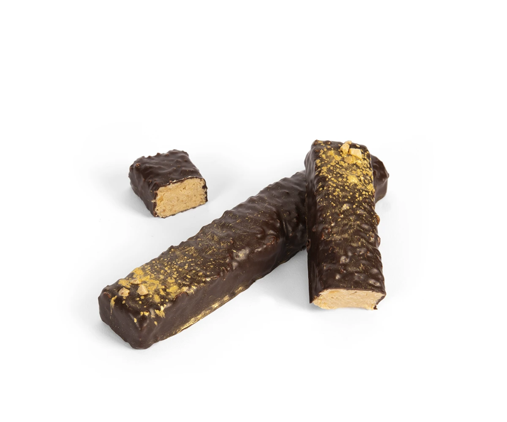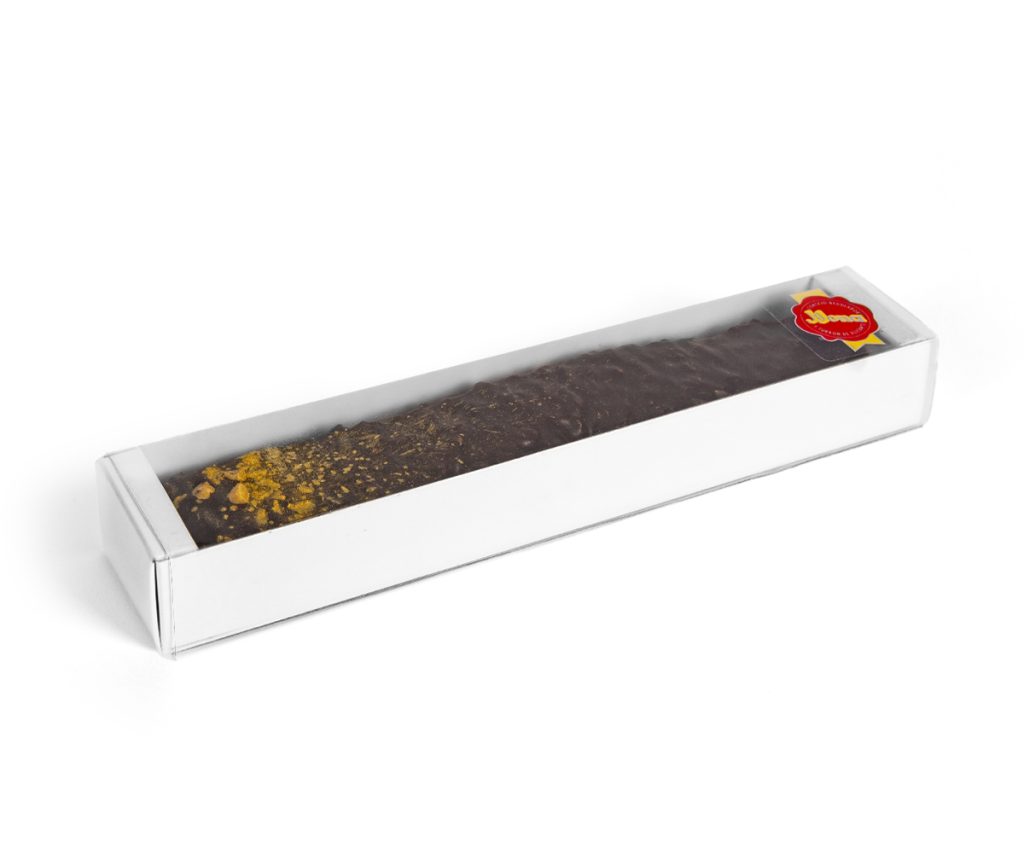 Barra Crujiente Turrón de Jijona y Chocolate Negro, una fusión de almendra marcona, miel de azahar y crujiente barquillo recubierto de cacao 70%.